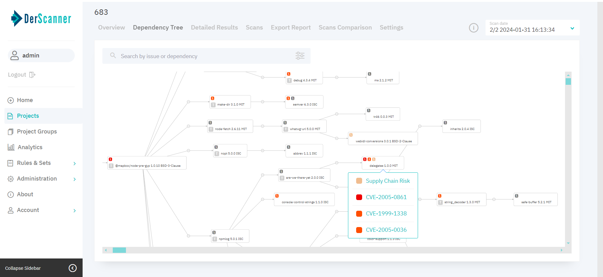 Managing project dependencies can be challenging, especially with deep structures of direct and transitive dependencies. DerScanner's Dependency Tree Graph simplifies this process by visually mapping your project's structure, highlighting where vulnerable packages are located. This clear visualization helps you quickly identify and address security risks.